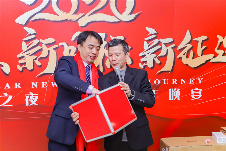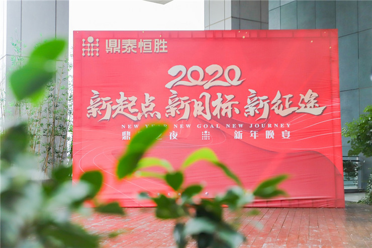 鼎泰之夜新年晚宴場面布置花了一番心思,寫著“2020,新起點,新目標,新征途”標語的巨大合影背景墻,十分引人注意。
